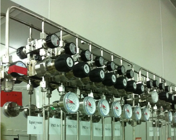 VMP:氣體閥門分配盤面,一般為SUS304鏡面或者拉絲盤面,上面裝有分配閥門管件,為終端單元,直接接入用戶設備完成氣體輸送。